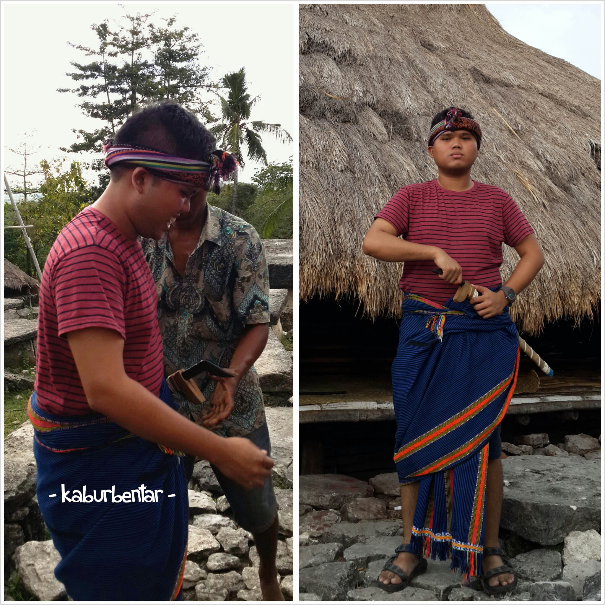 Setelah selesai melihat-lihat dan mengobrol dalam rumah, kami pun keluar. Tentu bisa ditebak apa yang kami lakukan setelahnya. Yup, sesi foto-foto! Selain foto sendiri-sendiri yang tentunya wajib hukumnya untuk dilakukan, kami juga berfoto dengan warga Bondo Kapumbu. Di tengah sesi foto, tiba-tiba seorang bapak menyuruh saya untuk berfoto menggunakan pakaian adat mereka. Belum sempat saya menjawab, dua orang pria lainnya dengan sigap memakaikan saya kain, ikat kepala, dan tak lupa parang simbol kejantanan orang Sumba. Voila! Dalam waktu kurang dari tiga menit, saya difoto di depan rumah adat lengkap dengan gaya berpakaian layaknya pria setempat. 😎