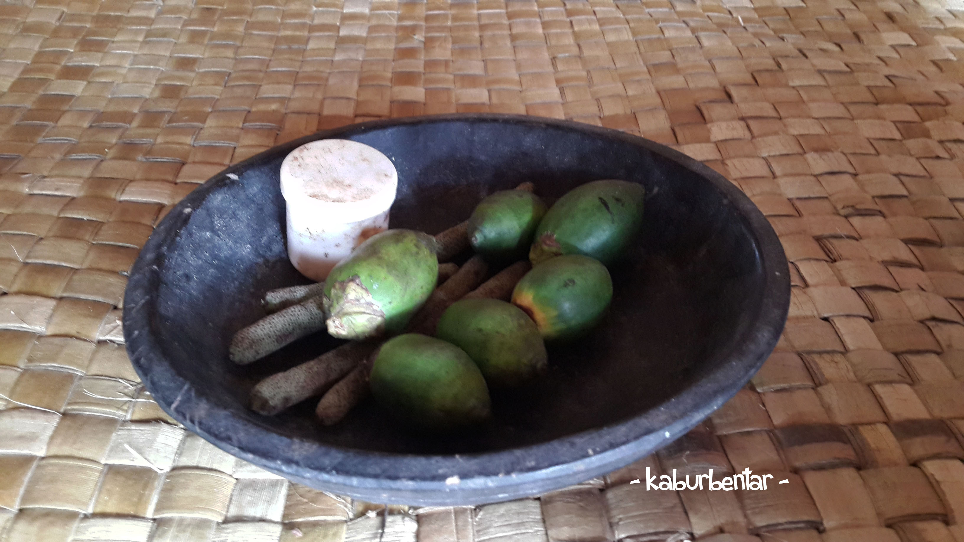 Tak lama kemudian, seorang wanita keluar dari dalam rumah membawa piring kecil yang terbuat dari kayu. Piring itu berisi buah pinang, buah sirih dan kapur. Pak Alex menjelaskan, sudah menjadi adat istiadat di Sumba untuk menyuguhkan tamu yang berkunjung dengan pinang, sirih dan kapur, meskipun tamu itu sesama warga di kampung yang sama. Pak Alex pun mempersilahkan kami untuk menyantap “kudapan” itu. Akhirnya teman saya yang paling penuh rasa ingin tahu, Gita, mencobanya. Daging buah pinang, sirih, dan kapur dikunyah bersamaan. Lama kelamaan, gigi Gita mulai berwarna merah. Entah reaksi kimia apa yang terjadi antara ketiga benda itu. Semakin lama dikunyah, semakin merah gigi dan mulut Gita. “Biasanya akan terasa pusing bagi yang pertama kali coba,” kata ibu yang membawa piring tadi.