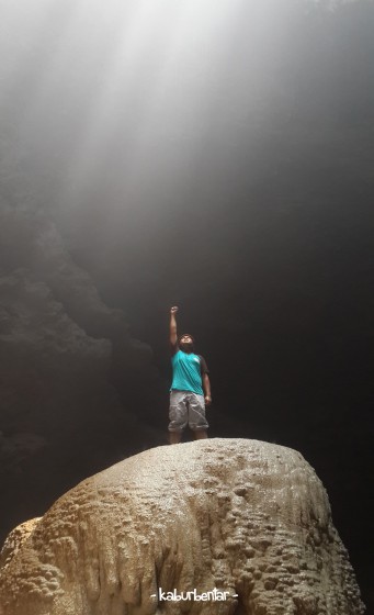Tidak lama kemudian, sampailah kami di “sinar matahari” yang dimaksud dari tadi. Di ujung jalur penjelajahan, ada seberkas cahaya matahari yang menembus lubang gua vertikal lainnya, Luweng Grubug. Lorong sepanjang 300 meter yang kami lalui tadi menjadi penghubung antara Luweng Jomblang dan Luweng Grubug. Lalu, “sinar matahari” yang dimaksud tadi kenapa ada jam-jamnya? Jadi, di dasar Luweng Grubug terdapat sebongkah batu besar, dan pada jam tertentu sinar matahari yang masuk akan jatuh pas di atas batu tersebut. Fenomena alam yang sangat bagus dan sayang untuk dilewatkan. Sayang untuk tidak dilihat mumpung di sana, dan tentunya sayang kalau tidak diabadikan dengan berfoto-foto, hehe.