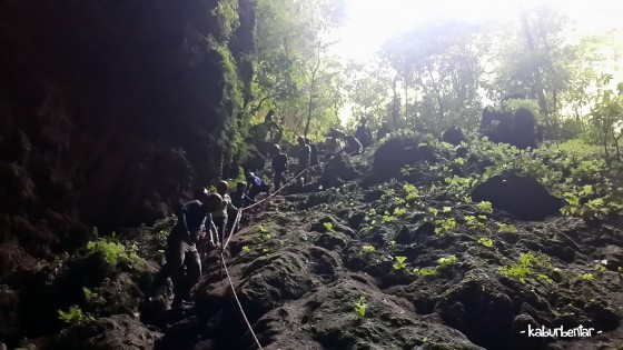 Sebenarnya terdapat beberapa jalur yang bisa dilewati oleh pengunjung untuk masuk ke dasar gua. Kami diarahkan untuk masuk melalui jalur dengan kedalaman 60 meter. Kami pun diturunkan bergiliran. Sekali giliran, dua orang diturunkan bersamaan. Saya membayangkan berapa beban yang harus ditahan setiap menurunkan kami-kami ini. Wew.