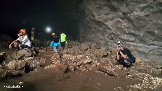 Setelah semuanya turun, kami bergerak masuk ke dalam gua. Kami berjalan menyusuri lorong gelap di dalam gua. Saya pikir jalur yang akan kami tempuh adalah tanah berbatu, namun ternyata tanah becek. Pantas saja disediakan sepatu boots oleh operator caving. Dan untungnya ada jalan batu yang disiapkan, mungkin oleh operator caving, sehingga memudahkan penjelajahan di dalam lorong gua.